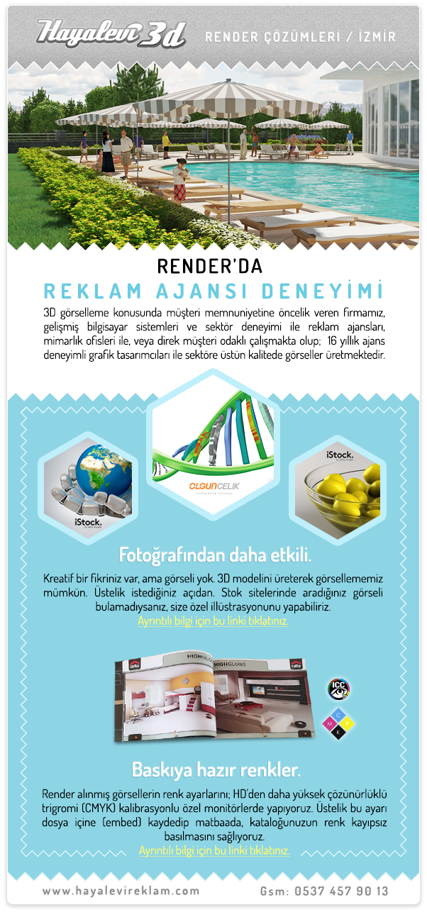 3D modellenebilen tüm ürünlerin görsellerini üretmeyi, kaliteli resimlemeyi amaçlayan firmamız, 16 yıllık reklam camiası deneyimi ile tüm görselleme ürünlerini satış arttırıcı temelde oluşturmaktadır.